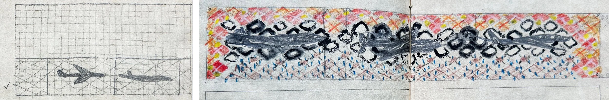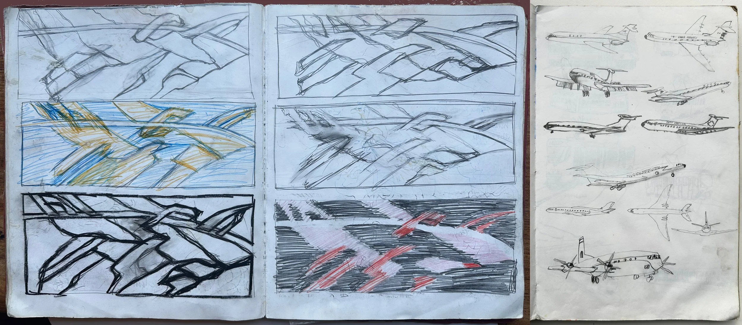 Looking also at my sketchbooks from the time, I found a thread which started with drawings of the sky, with aeroplanes and clouds. My first attempt at this subject matter (above right) fits into the worst category of cloud - solid and static with a badly painted aeroplane. I remembered another panel and although I could only find the drawings that related to it (below left), this one was definitely better, with pink and yellow glass and drippy bits of painting on the clouds which are starting to move in a diagonal direction.