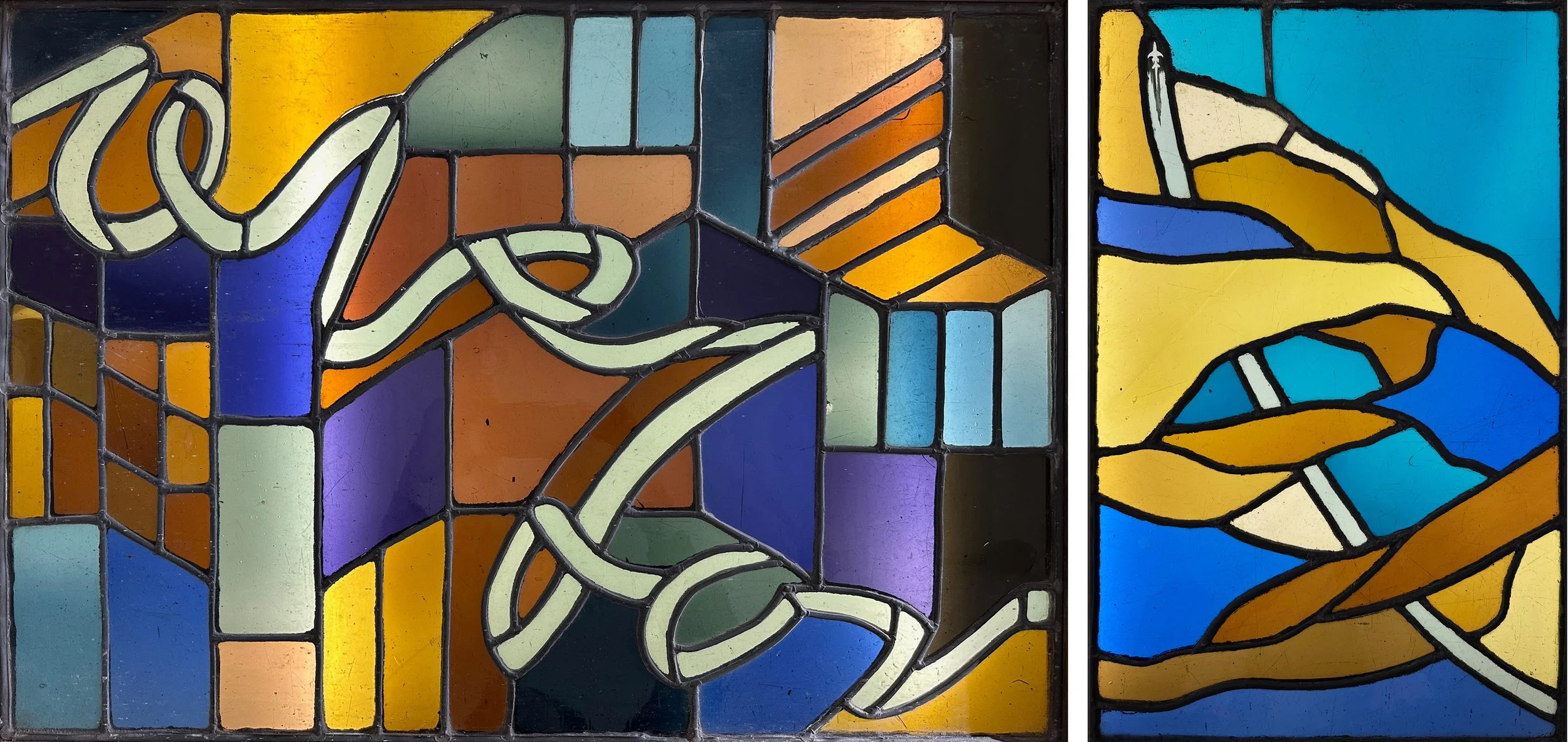 Following on from the last post about my first commission (shown above left) I have been searching through my old work. I made the three pieces above & below at The Central School of Art to the dimensions of windows in my parents’ house in Wimbledon in front of which these all used to hang. Initially I thought I could reuse the glass for the restoration of my first ever commission, but there were no exact colour matches. Then I started to quite like the pieces and decided to save them as they are, unpainted and with great colour combinations in beautiful glass made by Hartley Woods.