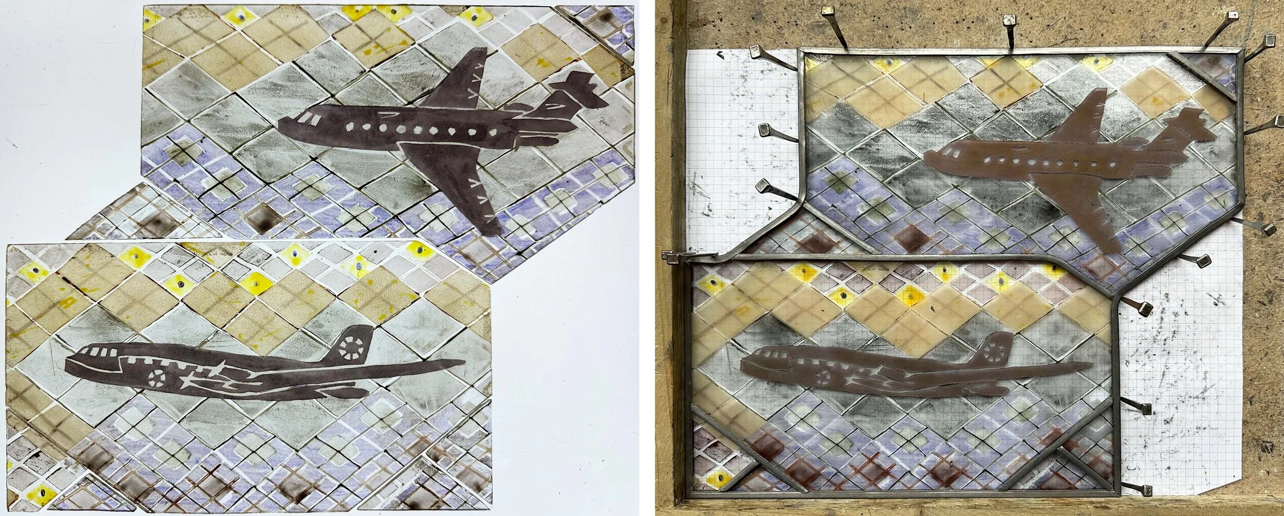 I found two aeroplane panels among my stack of old stained glass. I had a feeling there were once three, but I could just be remembering the drawings, as the one with the tick next to it only had two planes (above left). I’d later made them into patchworked panels having chopped off the corners where fixing holes had been drilled. This time I kept all the original pieces I could find and leaded them up as a way of keeping the pieces together. I particularly liked the backgrounds to these designs, on the diagonal to give a feeling of the expanse of the sky scape, with plain diamond clouds behind the planes and then the pattern changing as it spreads above and below them. I had never chucked my geometric backgrounds out with the vehicles and machinery, and had a go this week (shown at the bottom) at using the pattern again in black and white with a cloudy tree top standing in for the original flying machines .