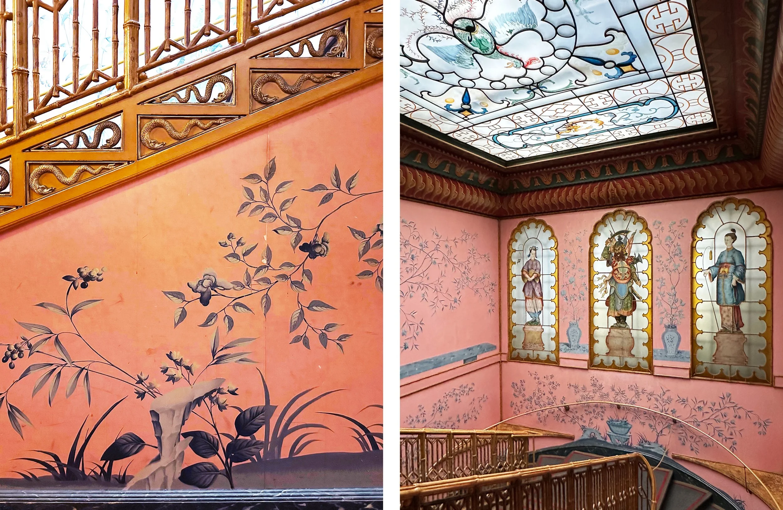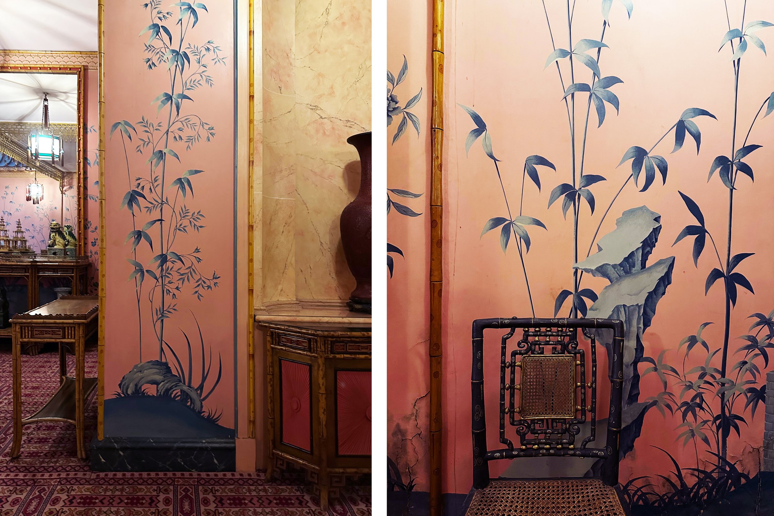Here, nature inspired wallpapers are everywhere, enlivened by geometric patterns on borders, carpets and ceilings. The blue and pink paper that covers the walls of the Long Gallery and the staircases at either end is a hand painted copy of the original, which was probably hand-painted in distemper by Frederick Crace around 1815, so produced in Britain but strongly influenced by work exported from China and seen elsewhere in the pavilion.