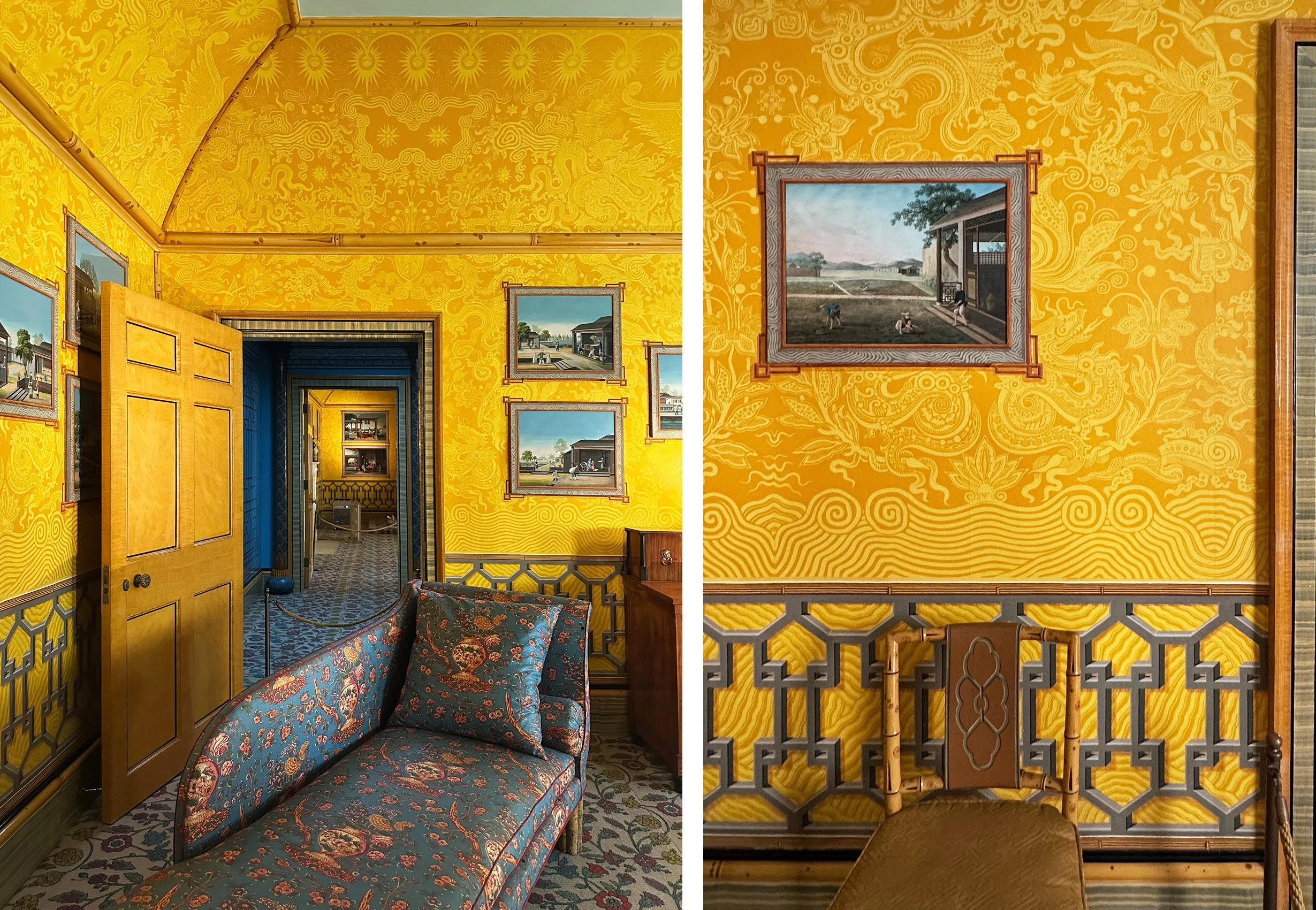 Elements of the design are repeated in the version in the upstairs bedrooms that uses the chrome yellow that was a new and popular colour of the period - the colour of joy and madness that I often have to avoid (or sneak in small amounts of) in my designs for hospitals. Here bamboo is used as an edging, there is a trompe l’oeuil pattern at the bottom and, best of all, there are actual Chinese paintings on the yellow walls that are a series illustrating the production of cotton and tea.